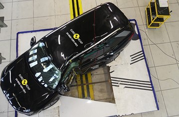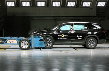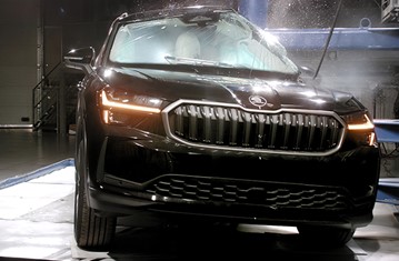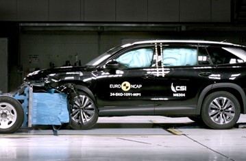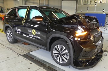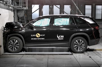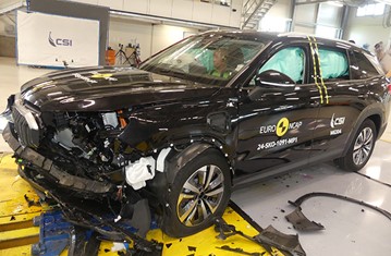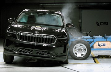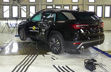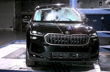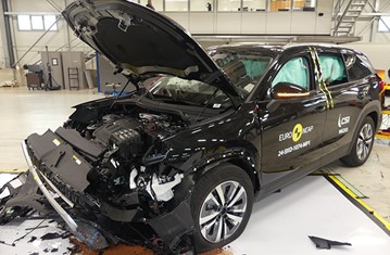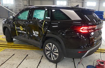 The passenger compartment of the Kodiaq remained stable in the frontal offset test. Dummy numbers showed good protection of the knees and femurs of both the driver and passenger. Škoda showed that a similar level of protection would be provided to occupants of different sizes and to those sitting in different positions. For the passenger, all critical body areas were well protected. Analysis of the deceleration of the impact trolley during the test, and analysis of the deformable barrier after the test, revealed that the Kodiaq would be an aggressive impact partner in a frontal collision. The deformable impact barrier was 'bottomed out' in places and a penalty was applied. In the full-width rigid barrier test, protection was good or adequate for all critical body areas of the driver and rear passenger. In both the side barrier and pole impact tests, protection of all critical body areas was good and the car scored maximum points in this part of the assessment. Control of excursion (the extent to which a body is thrown to the other side of the vehicle when it is hit from the far side) was found to be adequate. The Kodiaq has a countermeasure to mitigate against occupant-to-occupant injuries in such impacts and this performed well in Euro NCAP's test, with good protection of the heads of both front occupants. Tests on the front seats and head restraints demonstrated good protection against whiplash injuries in the event of a rear-end collision. A geometric analysis of the rear seats also indicated good whiplash protection. The Kodiaq has an advanced eCall system which alerts the emergency services in the event of a crash, and there is a system to prevent secondary impacts after the car has been in a collision. Škoda demonstrated that the doors and windows would be openable to allow occupants to escape in the event of vehicle submergence.